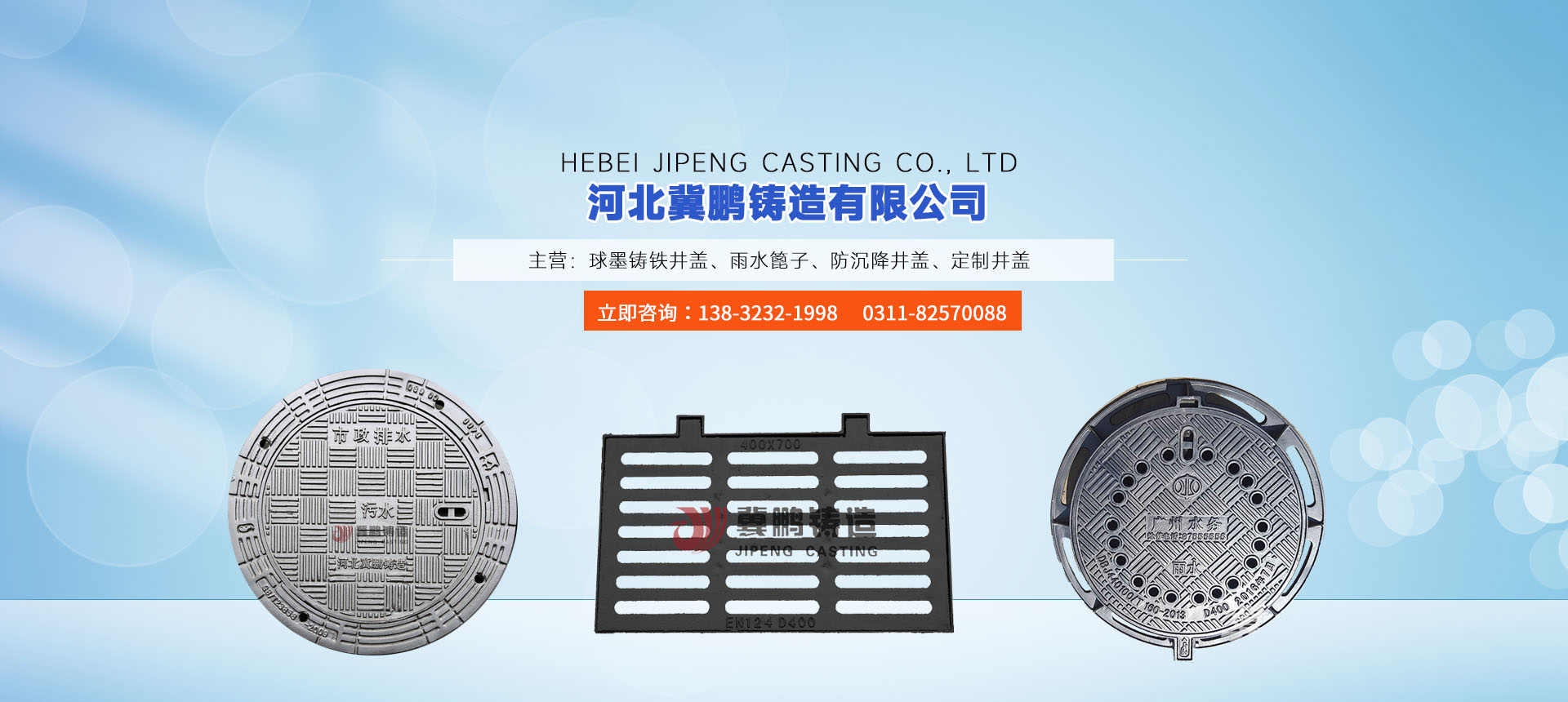 河北冀鹏铸造有限公司(原灵寿县永胜铸造有限公司),位于河北省石家庄灵寿县青同镇韩洼村;有着近40年的专业铸造历史,占地百余亩,注册资金1500万,职工总数85人,其中技术人员20人,公司拥有先进的自动造型生产线1条、抛丸机3座、机床加工数十台,与澳大利亚合资建有一条国内先进的浸涂喷塑线。我公司以生产球墨铸铁井盖、管件;近3年产值8000万;于2003年通过了ISO9001:2008产品质量管理体系认证,2017年12月公司自建C级研发室,2020年顺利通过B级企业认证,2022研发了新型球墨铸铁管件获得专利。